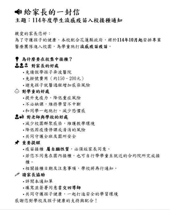 親愛的家長您好: 為了守護孩子的健康,本校配合花蓮縣政府,將於114 年 10 月起安排專業醫療團隊進入校園,為學童施打流感疫苗疫苗。