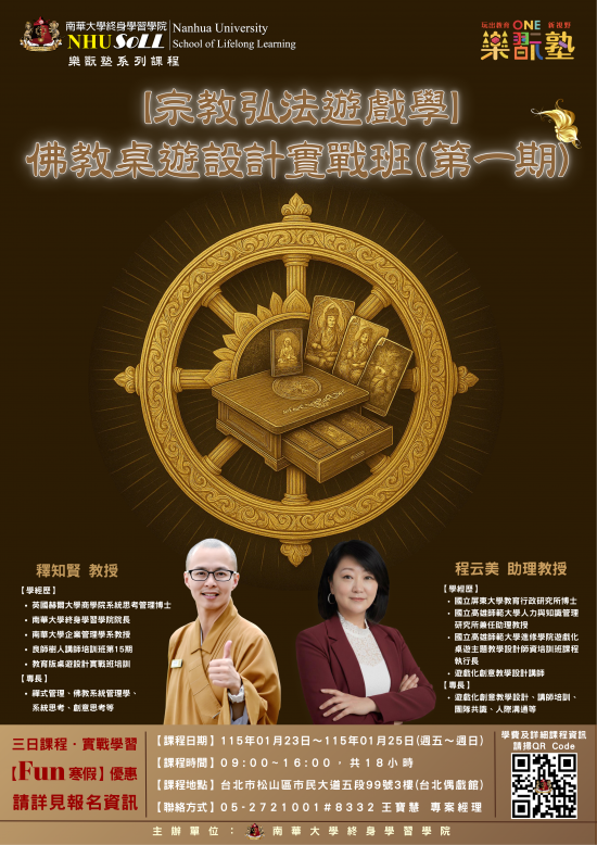 (三) | 此課程旨在培育有意投入桌遊教學的講師,提升其所需具備的知識與技能。透過創新的遊戲設計實踐,促使講師以更有趣的方式弘揚佛法,激發學生的學習興趣,探索佛教的多元面向。 |