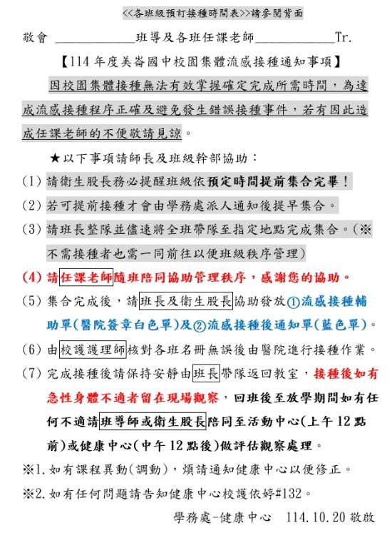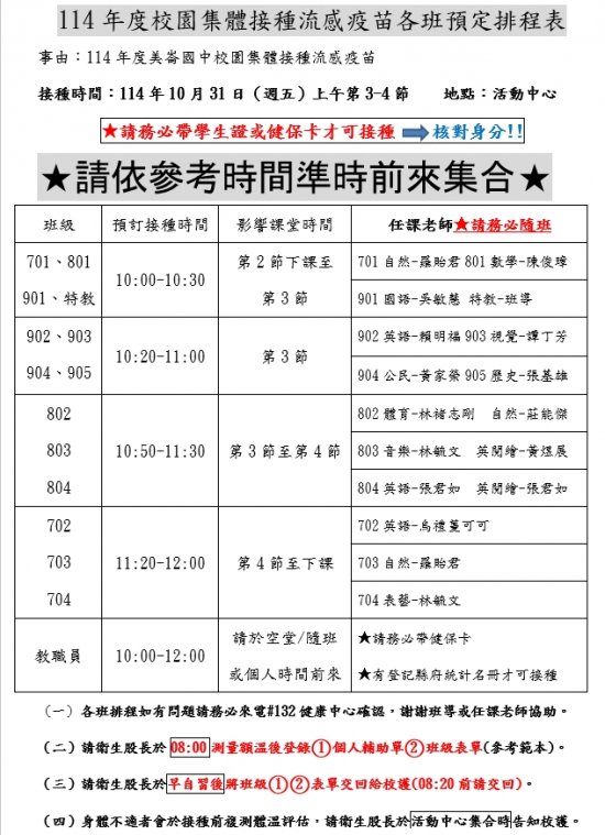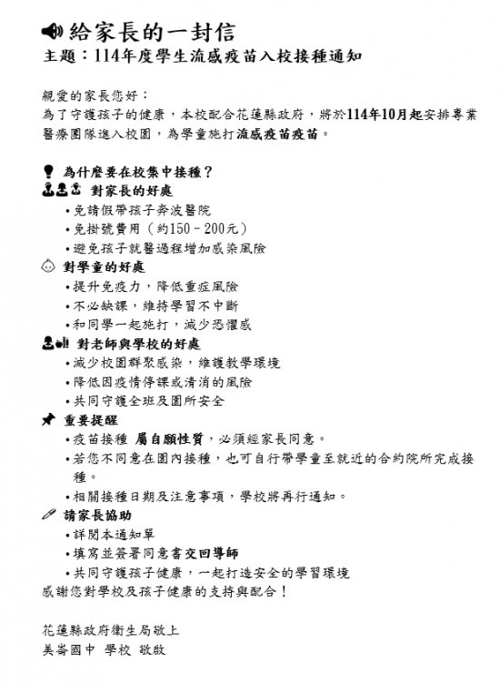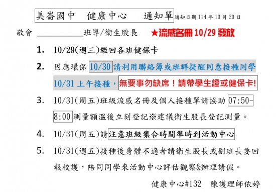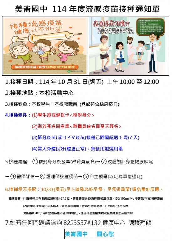 本校於114年10月31日(週五)上午10-12點辦理流感疫苗接種作業,有關流感疫苗廠牌依文於前一日公告通知,相關流感接種後注意事項及班級通知事宜請詳閱附件,特此公告請全校師生詳閱,謝謝配合。