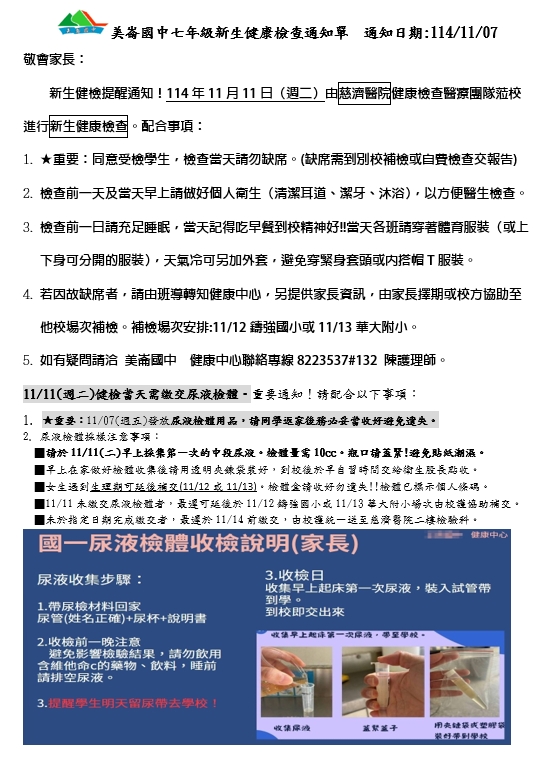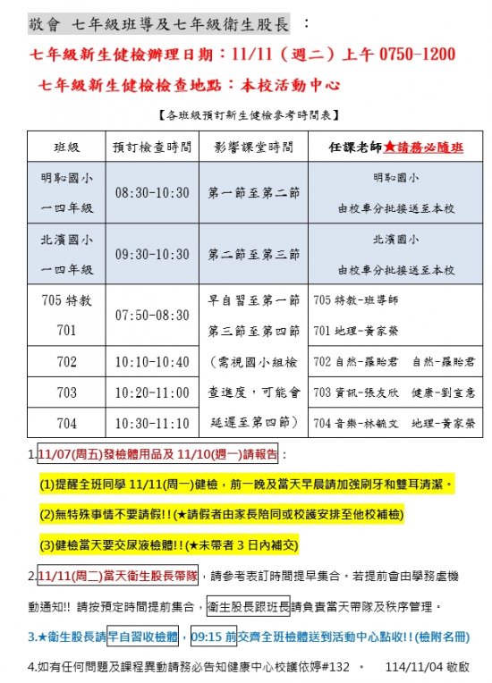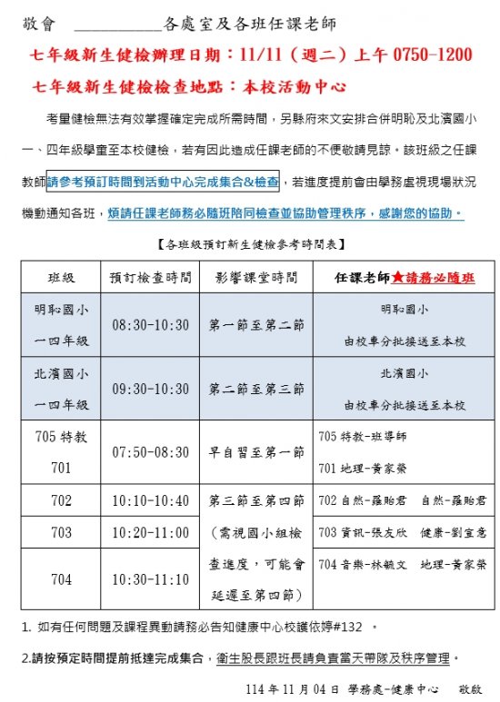 本校訂於114年11月11日(週二)合併北濱及明恥國小辦理新生健檢,今日朝會已辦理七年級新生健檢宣導,相關內容請師生家長詳閱後配合,謝謝。