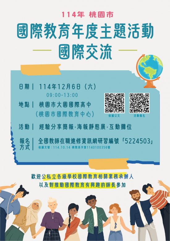 | (一) | 目的:藉由撰寫及執行經驗分享與交流,推廣桃園市國際教育及交流活動;彙整桃園市各級學校推動國際交流之成果,辦理「易拉展」海報展及互動攤位,展現多元交流面貌。 |