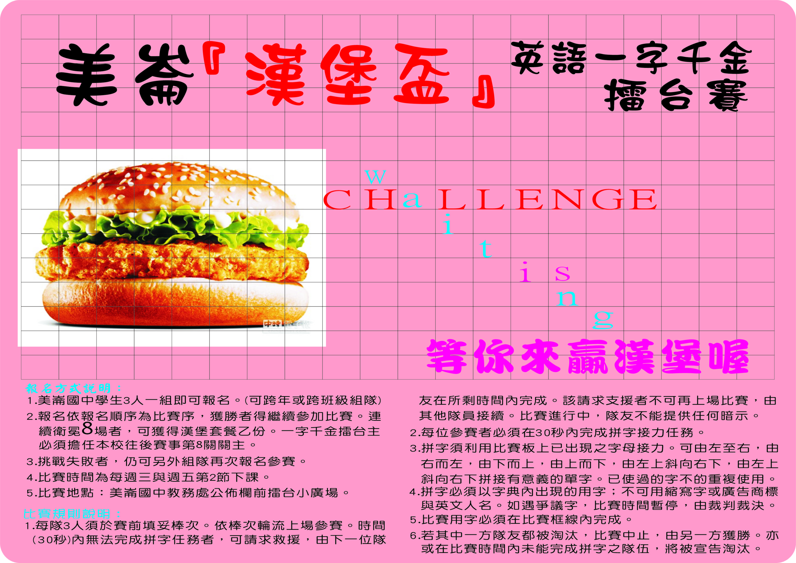 美崙國中『漢堡盃」英文一字千金擂台賽開始報名囉! 過關斬將,等您來贏漢堡喔!
