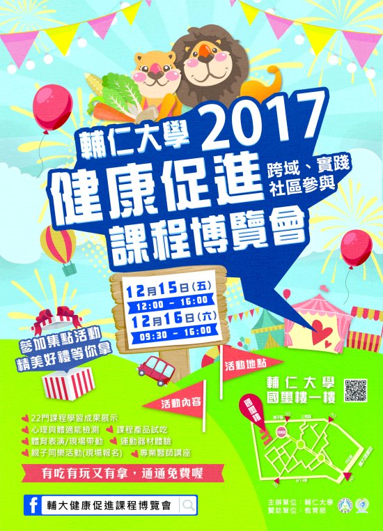 | 二、 | 活動內容:輔仁大學 22 門健康相關課程學習成果展示、運動器材體驗、專業醫師講座、課程產品試吃、心理與體適能檢測、親子同樂活動(現場報名)、輔大診所提供簡單健檢、以及參加集點活動兌換精美好禮等等活動。 |