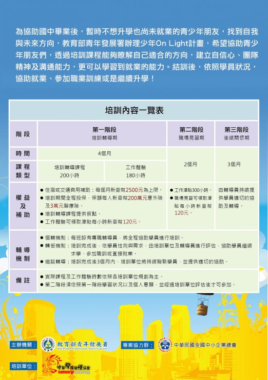104年度少年On Light計畫,參訓資格:年滿15~19歲,國中畢業、修業完成或高級中等學校休退學者,目前未升學未就業、且未參加任何職訓課程之青少年;名額12位。詳如附件 說明