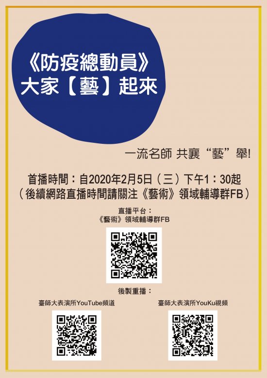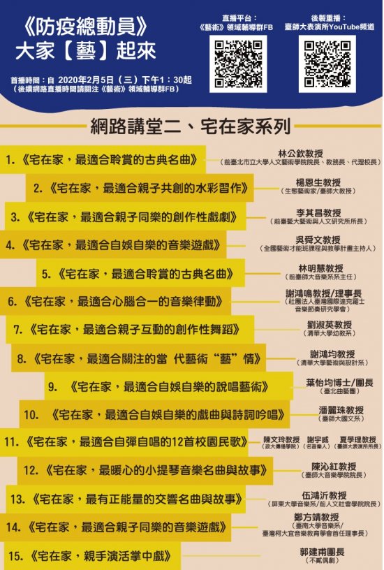 一、因應 2019新型冠狀病毒疫情持續延燒,本校表演藝術研究所夏學理所長號召 26 位一流名師,自 2020 年 2 月 5 日起,共同攜手籌組 21 門網路課程,分別為「“藝”起抗“疫”」與「宅在家」等兩系列課程。