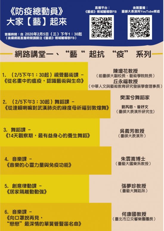 (一)「“藝”起抗“疫”」系列的六門課,係透過視覺藝術、舞蹈、音樂、律動等,讓民眾認識傳染病對文化藝術的影響、心靈力量與藝術養生之道。