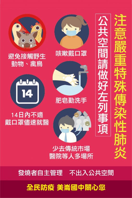 1.勤洗手維持手部清潔、注意呼吸道衛生及咳嗽禮節,拱手不握手。