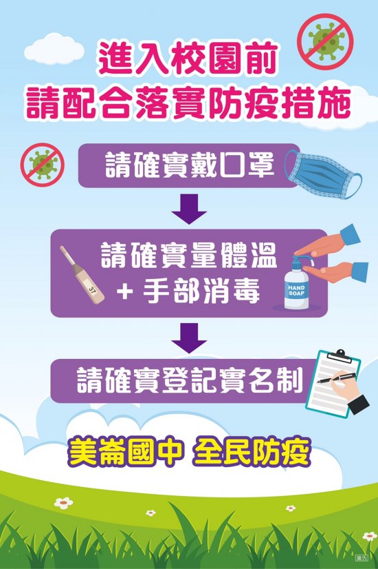 (1)入校於穿堂防疫站測量體溫時請保持社交距離。