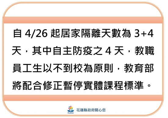 配合防疫暫停實體課程該班級(含校隊或社團)之家長請注意配合,衛生所請本校協助發放兩劑快篩劑,請於今日(5/5 周四)以下時段由家長到校領回,特此通知。