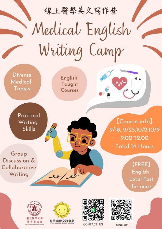 | 一、 | 為促進學生對醫學領域之認知並有效提升英文實力,臺北醫學大學進推處結合本校專業醫療師資、國際師資及專業英文教育講師資源,採用營隊設計深入淺出的英文醫學寫作課程,以遠距教學擴大學生之國際視野,並以實做練習提升其英文寫作能力。 |