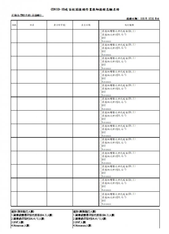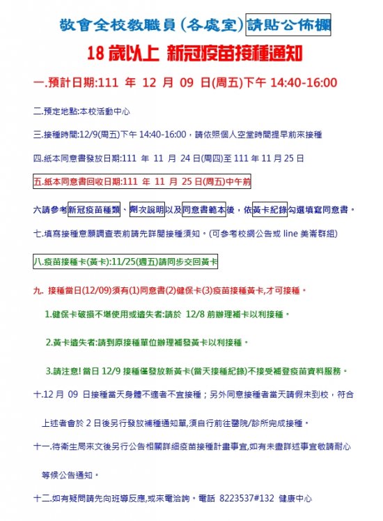 本校預定111年12月9日(週五)下午辦理18歲以上新冠疫苗接種(全校教職員),今日各處室(辦公室)發放紙本接種意願統計表,於明日11月24日(週四)再行發放同意書,請配合於11月25日(週五)前交回同意書及黃卡,相關疫苗接種訊息(含各類疫苗接種須知)敬請全校教職員詳閱。
