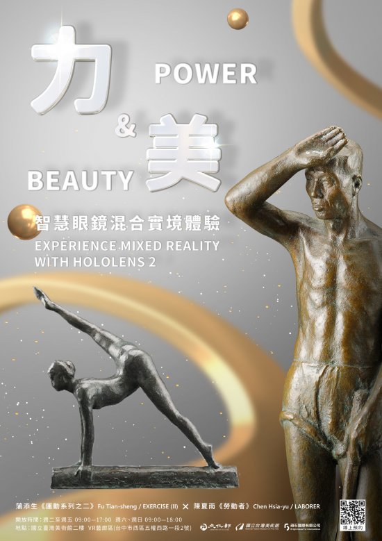 | 二、 | 國立臺灣美術館首檔 MR 智慧眼鏡導覽服務「力與美—智慧眼鏡混合實境體驗」,展示臺灣前輩藝術家蒲添生受到奧運女子體操運動所引發靈感的《運動系列之二》,以及陳夏雨傳達勞動階層生命力所創作的《勞動者》等 2 件作品。運用 3D 全視角模型、真人動態捕捉等技術,以 Hololens2 智慧眼鏡呈現雕塑作品活化後的動態展演。歡迎至國立臺灣美術館官網預約體驗 https://artvr.ntmofa.gov.tw/。 |