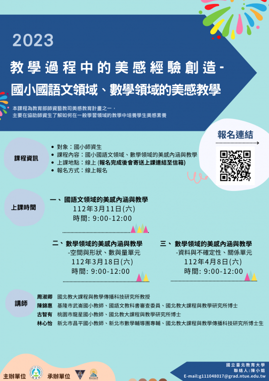 | 二、 | 教育部師資培育及藝術教育司委託國立臺北教育大學執行中小學師資生美感素養培力課程發展計畫,另本校協助辦理美感教案設計徵選。為讓師資生瞭解如何在學科/領域教學中融入美感素養,特辦理線上研習課程,鼓勵師資生結合學科/領域教學,於國語文、數學(國小)與綜合活動(國中)等上述三個學科/領域融入美感元素,創發具有美感之教學設計,供全國中小學教育人員參考。 |