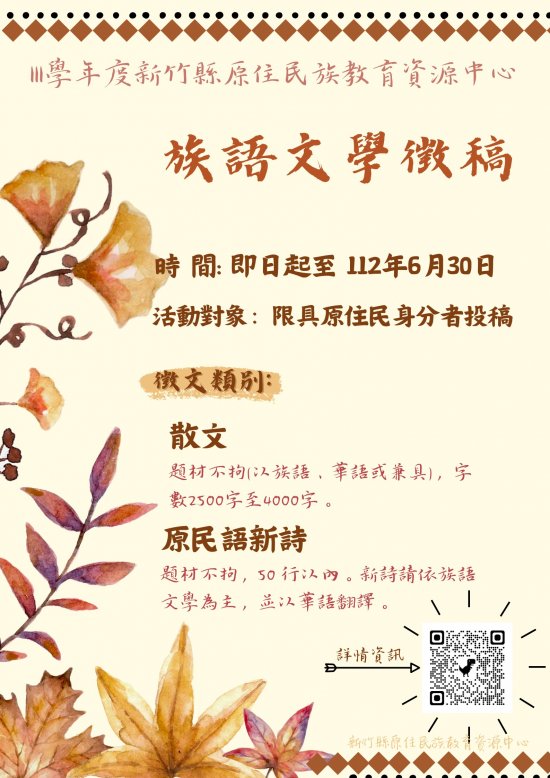 | 2、 | 原民語新詩:題材不拘, 50 行以內。新詩請依族語文學為主,並以華語翻譯。 |