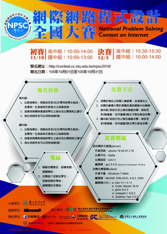 一、本活動係為提升資訊教育水準及培育資訊相關人才,以鼓勵學生從事程式設計來解決問題,培養網際網路程式設計專才。 二、報名日期: 105 年 10 月 1 日至 105 年 10 月 31 日。 三、報名網址: http://contest.cc.ntu.edu.tw/npsc2016/ 四、檢附參賽辦法及海報電子檔案各 1 份。