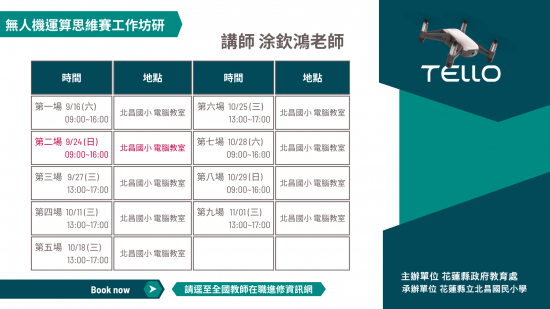 | 二、 | 為配合「2023 花蓮縣華紙公益盃全國無人機運算思維大賽」特辦理 9 場共訓研習課程,以期本縣選手熟悉競賽相關規定,穩定選手參賽當日狀況,課程資訊如下: |