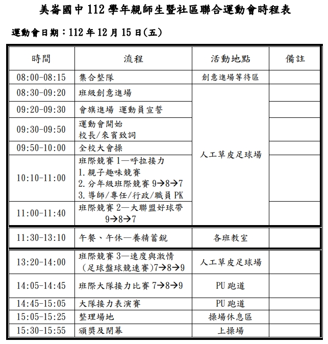 公告美崙國中112學年親師生暨社區聯合運動會 活動時程表,請各位參加登記入校家長儘量在8:00-8:30間入校。為了校園師生交通安全,家長車輛請停在校外,步行進入校內。