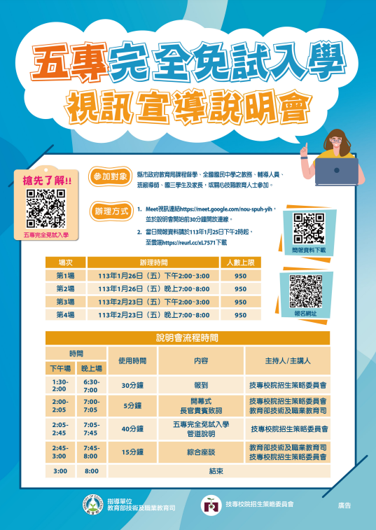 五專升學進路 113 學年度新設「完全免試入學」單獨招生管道,無須國中教育會考成績,適性選擇,升學進路更多元。為協助親師生瞭解五專完全免試入學管道的特性、重要時程及積分採計項目等內容,特辦理旨揭說明會。