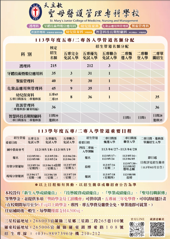 聖母醫護管理專科學校五專多元入學訊息
