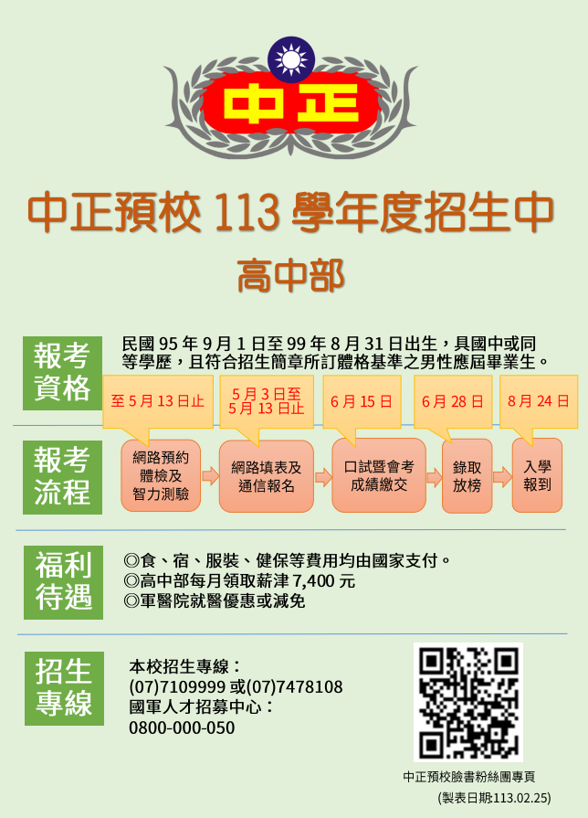 中正國防幹部預備學校 113 學年度高(國)中部招生訊息