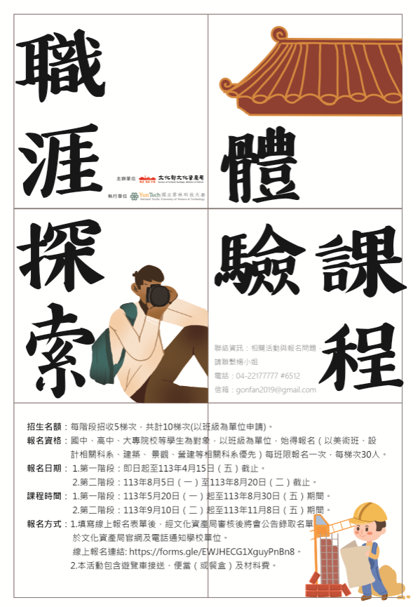 - 課程內容:主題包含彩繪作、泥塑作、土水作及木作等職涯探索與實作體驗課程,課程程度約為 4 小時。