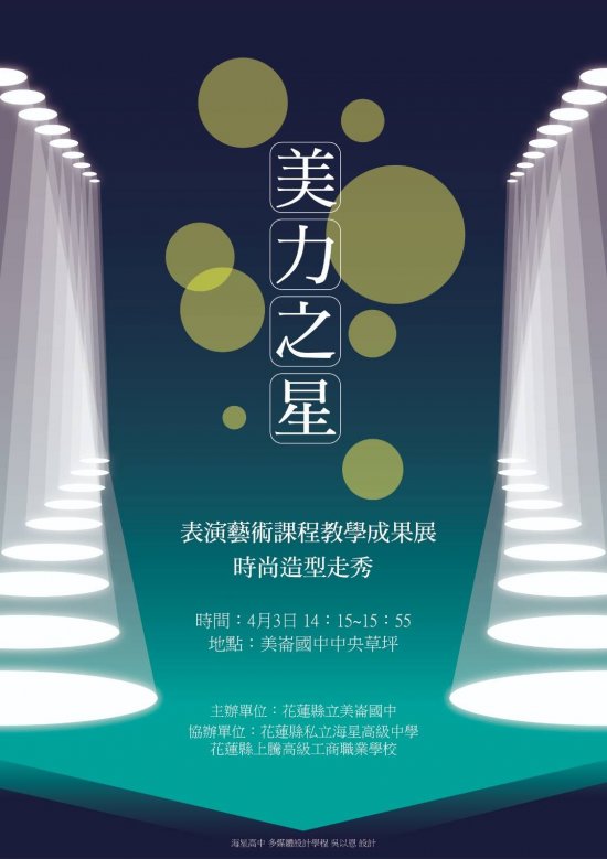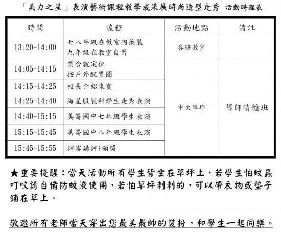 1. 本校 4/3〈三〉下午舉辦「美力之星:表演藝術課程教學成果展─時尚造型走秀」,海報、活動時間表、班級座位圖詳如附件