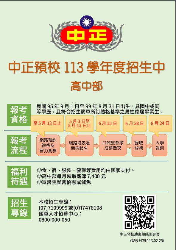中正國防幹部預備學校 113 學年度高中部招生訊息