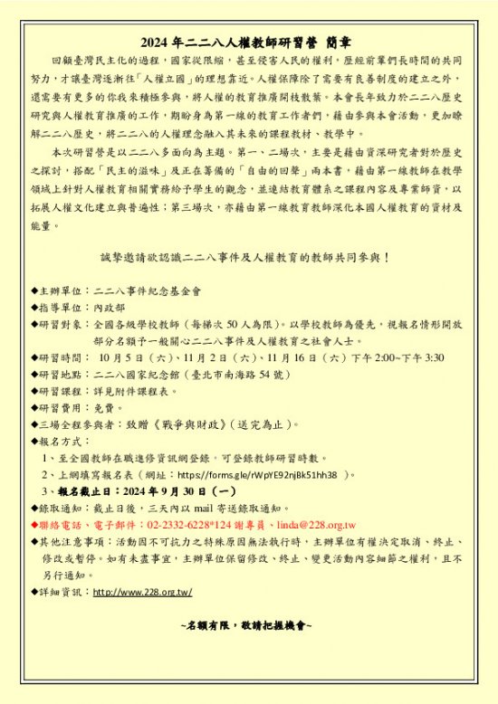 二二八事件紀念基金會辦理「2024年二二八人權教師研習營」
